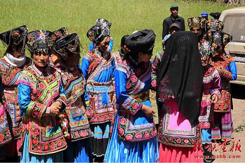 娶親要請客,當?shù)乩圩逭埧椭恍杩陬^傳話,凡是知道的親戚朋友都會來參加。娶親隊伍主次兩位主婚人,伴郎伴娘各一人,背新娘和嫁妝的二人,接親的四至六人,其中有一至兩個歌手,一行十二人組成。帶著早已為新娘準備好的花短衣、長裙、銀手飾、圍腰鏈、銀泡、銀項等飾物興高采烈地從新郎家出發(fā)。