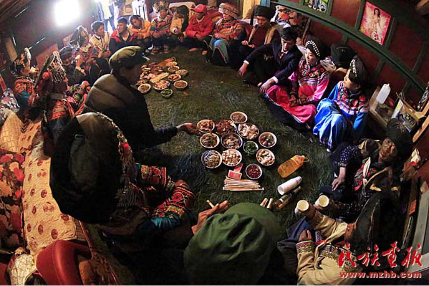 穿長衫,戴著包頭的新郎,把新娘接入正堂屋,將送親的人群迎進臨時搭建的青棚屋休息。青棚,是傈僳族人辦婚事時砍來毛櫟樹、香樹枝等臨時搭起的棚子。既清新又涼爽舒適??梢杂脕斫哟e客,也可以作為跳舞、唱曲子的活動場所。晚餐就在青棚里進行,宴席一般不用桌子,酒菜擺在青棚下面鋪好青松毛的地上,客人八個一圈,席地坐在青松毛上,圍著喜筵,既歡樂又開心的喝著美酒、品嘗佳肴。晚飯菜肴十分豐盛,足見主人家的好客和廚師的高超手藝。菜出雙不出單,菜的顏色出紅不出白。一切都象征著成雙成對,吉祥如意。