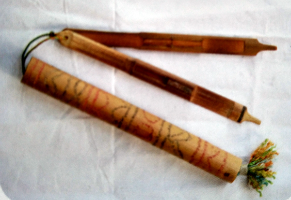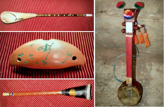 彝族特色樂器:補熱、阿烏和牛角小篳篥;右為彝族三弦