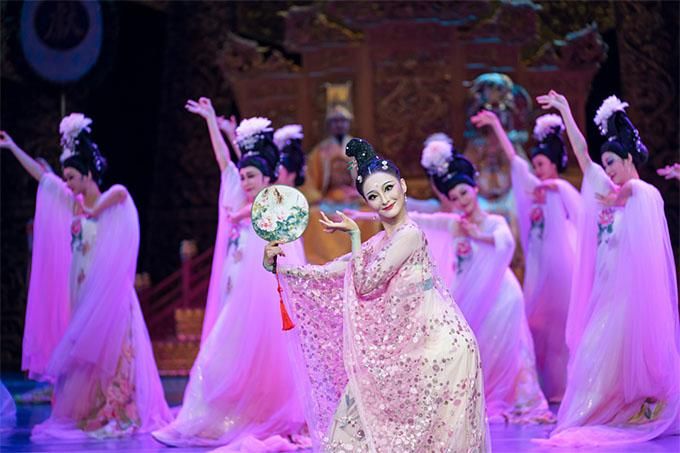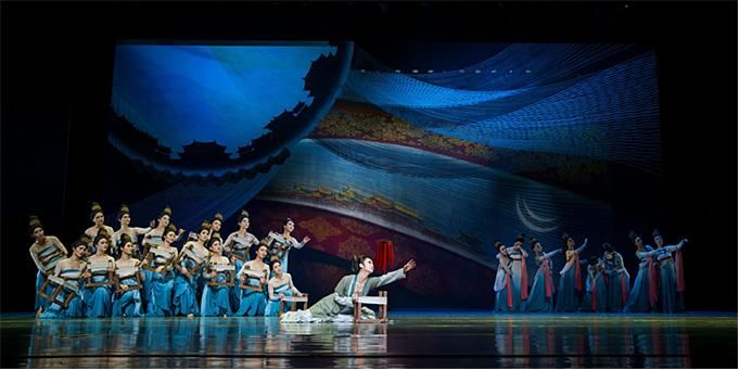 該劇在情感敘事和舞蹈語言上,采用“意中生象”“象中達意”的方式,從細微處融入唐代各地域各民族文化元素,凝練舞劇藝術(shù)品質(zhì):如取李白“醉入胡姬酒肆中”詩意演繹《胡姬舞》;取唐代畫家周昉《簪花仕女圖》畫意演繹《簪花舞》;取唐代畫家張萱《搗練圖》筆意演繹《搗練舞》;取王維“大漠孤煙直,長河落日圓”詩意生發(fā)《西涼武舞》等。在劇情發(fā)展和戲劇沖突中,設(shè)計符合人物性格的“獨、雙、三”主題舞段:凸顯西域風情的《胡旋舞》、表現(xiàn)曲江踏春的《采桑舞》和展示教坊舞技的《白纻舞》等情景舞段,展現(xiàn)了鮮明的民族文化交融特征,實現(xiàn)了中國傳統(tǒng)文化跨越時空的當代表達。