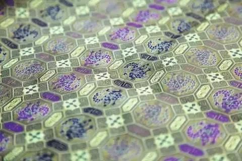 菱格四合如意紋錦根據(jù)民間收藏家手中的傳世品復(fù)制,通過(guò)分析測(cè)試原作的花紋色彩、絲線材料、織物結(jié)構(gòu)及加工工藝,并采用手工彩拋換道,使整匹面料的色彩千變?nèi)f化。
