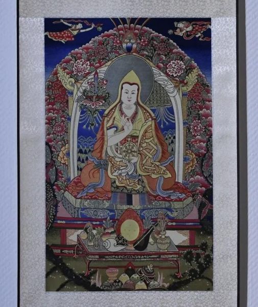 本作品的主體是藏傳佛教格魯派創(chuàng)始人宗喀巴。豐富的層次,飽滿的花紋,使其成為獨(dú)具風(fēng)格的高檔全真絲宋錦唐卡。