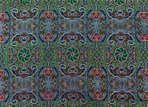 作品紋樣取材于漢、唐、宋、明、清時(shí)代的傳統(tǒng)蜀錦紋樣,采用的原料為純天然綠色纖維——染色桑蠶絲和粘膠棉漿絲。該織錦充分體現(xiàn)出蜀錦面料的色彩艷麗與富麗華貴。