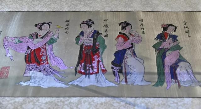 取材于唐代畫(huà)家張萱的畫(huà)作《虢國(guó)夫人游春圖》和《簪花仕女圖》,作品采用橫織豎裱的方式呈現(xiàn)。