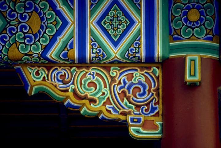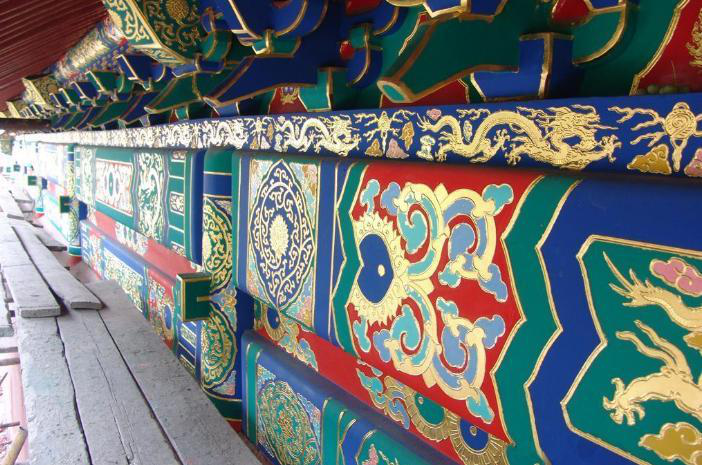 彩畫著色是一項關(guān)鍵的工序,不能有半點差錯。工匠們?yōu)椴煌伾O(shè)定了代號,一米色、二淡青、三香色、四硝紅、五粉紫、六洋綠、七佛青、八石黃、九紫色、十黑煙、十一紅等。將代號直接寫在地仗上,然后根據(jù)色號將各種色料對號入座,涂刷著色一、二遍,待干后再刷一遍光油罩光,以起保護作用。彩畫所用色料一般均為各色成品油漆。