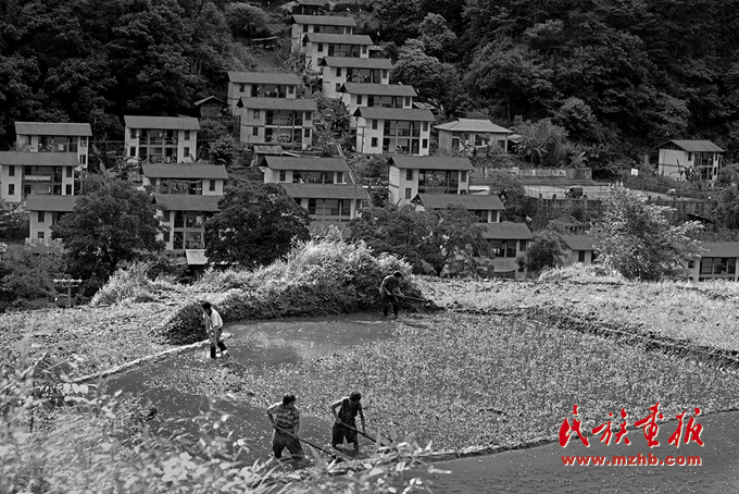 在依山而建安居房群落前獨龍族村民在翻挖、平整水田