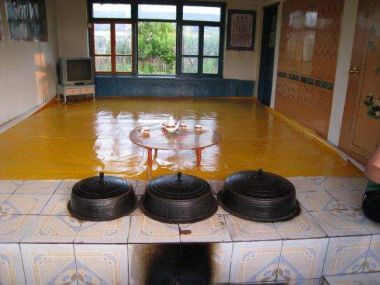 朝鮮族傳統(tǒng)民居建筑主要采用燒炕的采暖方式。一般有多大的屋子,就有多大的炕,這點與東北地區(qū)的漢族與滿族類似。一般在早上燒兩灶就可以維持一天,冬天非常溫暖,朝鮮族人們可以在炕上進(jìn)行任何活動。