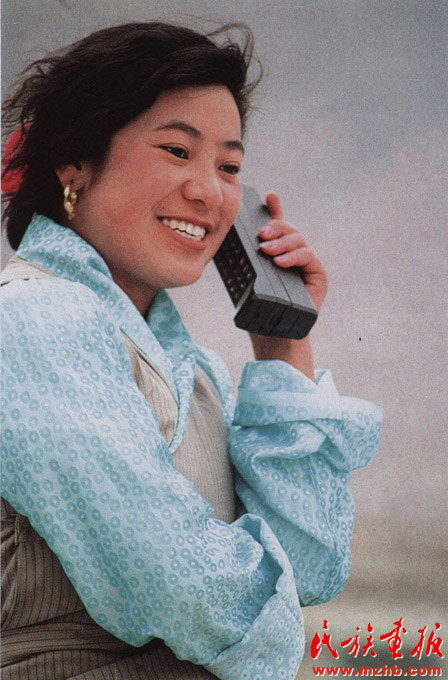 1995年,一位藏族婦女使用移動電話聯(lián)系業(yè)務。這一年除青海省外,全國各省區(qū)都開通了移動電話業(yè)務,極大地方便了群眾的聯(lián)絡與溝通?!睹褡瀹媹蟆?008年第12期