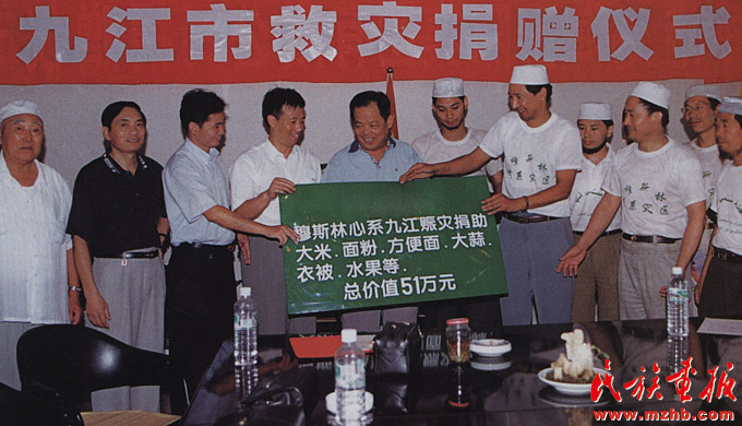 1998年,長江發(fā)生了全流域的特大洪水,災情牽動著全國各族人民的心,舉國掀起了“情系災區(qū)、奉獻愛心”的賑災熱潮。圖為回族企業(yè)代表在江西省九江市政府舉行捐贈儀式。《民族畫報》1998年第12期