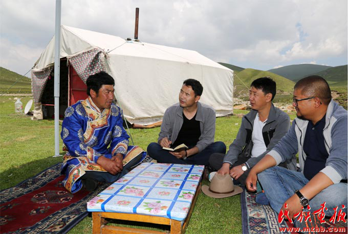 土旦(左)入戶向牧民宣傳草原法律法規(guī)和國家相關(guān)草原保護政策(黃若天 攝影)