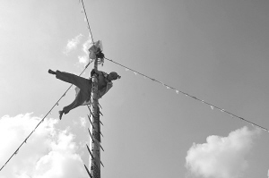 雖然符長洪教了理論絕招,可是在真刀、真火面前,第一次上場的徒弟們還是搖頭再搖頭,扭捏不敢上。此時,恰逢村里有人家邀請符長洪去表演,他就趁機帶著徒弟一起去。表演現(xiàn)場,符長洪用布包著刀刃,要幾個徒弟爬上刀梯。徒弟們上到梯頂后,符長洪卻把布條扯開,露出亮晃晃的刀刃,并在刀梯四周點燃火堆大喊:“下來吧!踩到刀上,走過火堆,你們就出師了!”