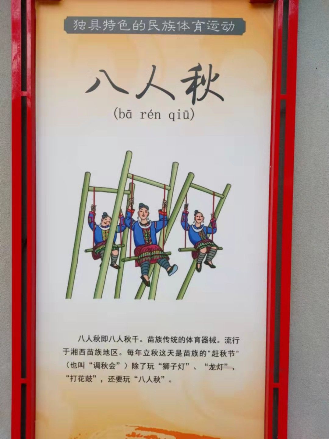 八人秋即八人秋千。苗族傳統(tǒng)的體育器械。流行于湘西苗族地區(qū)。每年立秋這天是苗族的“趕秋節(jié)”(也叫“調(diào)秋會”)除了玩“獅子燈”、“龍燈”“打花鼓”,還要玩“八人秋”。