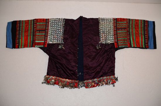 分布在臺(tái)江、施秉、鎮(zhèn)遠(yuǎn)三縣交界地一帶苗族村寨,以臺(tái)江施洞苗族為代表。該服裝上衣為家織布右衽衣,刺繡主要在前襟、衣領(lǐng)、肩袖部分,以黔東南苗族特有的破線繡為主,所繡圖案主要為龍紋,工藝精美,具有民族特點(diǎn)。