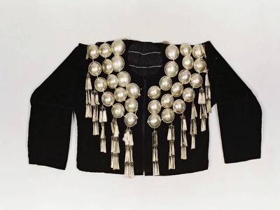 簡介:民族文化宮博物館收藏的這件銀飾“孔雀衣”,是景頗族女子盛裝時的一種服飾,征集于云南省德宏傣族景頗族自治州隴川縣,時間為20世紀(jì)50年代。這件銀飾“孔雀衣”長40厘米,胸圍108厘米,黑色平絨布制作而成,圓領(lǐng)對襟,領(lǐng)部、肩部和胸部墜銀泡、銀鏈、銀穗裝飾,黑白兩色相映成趣,精致華美。[詳細(xì)]