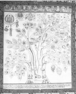 藏族“湯卡”的繪制有一個(gè)特點(diǎn),就是不注明繪制日期或繪制人的姓名(除個(gè)別的“曼湯”外),但藏族“曼湯”卻另有特點(diǎn),就是在“曼湯”的最上方留有一定位置來繪制醫(yī)學(xué)中的重要人物,特別是古代醫(yī)學(xué)家。藏族古代醫(yī)學(xué)家往往也是宗教人物。