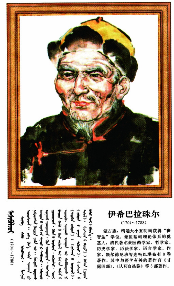 伊希巴拉珠爾(1704~1788),蒙古族,一名也協(xié)班覺、額爾德尼班智達·松巴堪布,蒙古衛(wèi)拉特人,著名蒙醫(yī)學(xué)家、文學(xué)家、天文學(xué)家哲學(xué)家。一生著作豐厚,其中對完善蒙醫(yī)理論體系有重要影響的著作有《甘露之泉》、《白露醫(yī)法從新》、《甘露點滴》、《甘露匯集》和《認藥水晶鑒》,在這些著作中他將藏醫(yī)學(xué)理論與蒙古人的體質(zhì)、生活習(xí)俗、居住地區(qū)的地理、氣候條件等具體實際結(jié)合在一起,進行創(chuàng)造性的理論研究,不僅豐富了臨床實踐的內(nèi)容,而且補充和完善了蒙醫(yī)學(xué)的理論體系,他將傳統(tǒng)蒙醫(yī)學(xué)“寒熱理論”與《四部醫(yī)典》中關(guān)于寒熱病理論的闡述進行有機結(jié)合,使之成為近代蒙醫(yī)學(xué)病性辯證的總綱,同時,他也闡述了將六基癥作為病因鑒別診斷的核心及其臨床表現(xiàn),使“六基癥”學(xué)說從理論到實踐都獲得了比較系統(tǒng)的發(fā)展。占布拉道爾吉是19世紀著名的蒙藥學(xué)家,他編著的《蒙藥正典》(又名嗚嗚蒙藥圖鑒)共收載蒙醫(yī)臨床常用藥物879種,按礦物、植物和動物等分為8部24類,附插圖576幅,對每種藥物的產(chǎn)地、形態(tài)、性味、功能、入藥部分、采集加工、炮制方法、主治、用法等都闡述詳盡,并且每一味藥物都標寫了蒙、藏、滿、漢四種文字的藥名,具有很高的參考價值。該書還附有外科術(shù)療器具圖解,以及放血穴位、針灸穴位、人體各部分劃分圖解說明等。敏如爾古布拉(1789-1838)編撰了蒙醫(yī)學(xué)方劑巨著《方海》,是一部比較系統(tǒng)完整的蒙醫(yī)藥物方劑學(xué)經(jīng)典著作,收載方劑近200種,分為76章,進行詳盡的論述和評點,同時對相關(guān)疾病的病因、病機、分類和治法等也做了簡要論述。