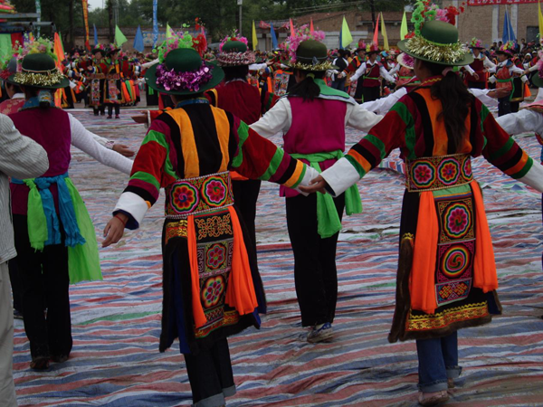 不同地區(qū)的土族舞蹈具有相對獨(dú)立性,互助的“安昭”、民和的“納頓”、大通的“踏灰”、同仁的“於菟”、甘肅卓尼的“嘎爾”等是最具代表的民間舞蹈。“安昭”,土語稱之為“千佼日”,意為“彎曲”或“轉(zhuǎn)圈”,是土族民間喜慶節(jié)日和婚禮儀式中,用于禮贊祈祝的一種圓場群舞,也是一種歌舞結(jié)合、無樂器伴奏的集體舞蹈。一般由男女各半圍成圓圈,由一男子帶領(lǐng),一唱眾和。舞蹈動(dòng)作簡單質(zhì)樸,舞者兩手由右胯旁起向左上方至右上方劃圓弧,變?yōu)樽笫智谀X前,右手高居于后,似雄鷹翱翔于藍(lán)天?!办遁恕蔽杓椿⑽琛!办遁恕保枪糯藢⒌姆窖苑Q謂。每年農(nóng)歷十一月二十日祭山神時(shí),名為於菟的舞者在赤裸的上身繪制虎豹圖案,模仿虎的形象“前端腿跳”舞蹈,達(dá)到祀神驅(qū)邪、祈求平安的目的。