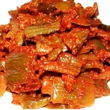把鹽漬好的青菜削去老葉、粗皮,用甜酒、糖拌勻,再按比例加入蒜苗、蒜頭、辣椒粉、冰糖、食鹽和適量白酒,調(diào)好后分壇包裝,密封貯存。約兩個月后即可出廠銷售。