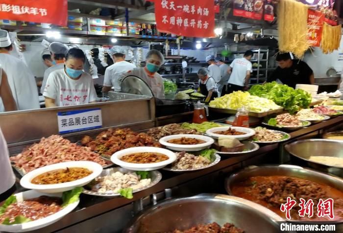 記者走訪徐州市區(qū)大街小巷發(fā)現,各大餐館、飯店提前備足了貨源,店方更是拉起橫幅,布置花籃,紛紛推出特色伏羊菜品迎賓納客。11日中午,徐州七百歲羊肉館濱湖店店長張輝介紹,飯店在伏羊節(jié)期間預計每天要用掉大概15只羊的鮮羊肉。店內包間、大廳空桌早在一周前就被預訂滿。當天一早,附近很多市民就帶著鍋碗來店里打羊肉湯。中午,由于吃伏羊的客人較多,一樓大廳的餐位已經翻臺多次?!胺蚬?jié)第一天,單獨他們這一個店面最少接待顧客50桌近600人次。