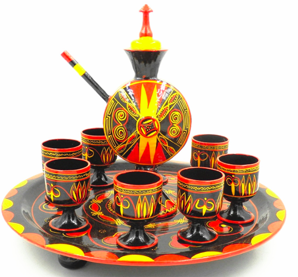 彝族漆器種類很多,僅餐飲具就有餐桌、飯盤、肉盤、湯缽、大小碗、勺、舀酒瓢等;酒具,有酒壺、酒杯等。民族風格特別突出的是鷹爪杯、雁爪杯、牛角杯和野豬蹄杯等飲酒器皿。鷹、野豬等都是很兇猛的禽獸,用兇猛動物身上的材料做酒杯,標志著主人的靈巧與勇猛。他們認為戰(zhàn)勝了靈巧與兇猛的東西,其本身就更靈巧與勇猛。