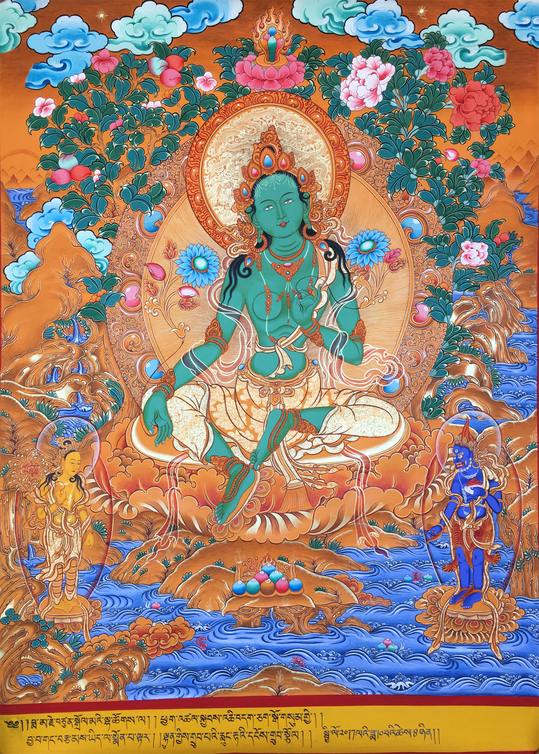 綠度母即觀世音菩薩之化身,為二十一度母之主尊,持通本尊咒,能總持二十一度母之功德。修持此尊密法,能斷生死輪回,消除一切魔障、業(yè)障,并能消災增福,延壽廣開智能,凡有所求無不如愿成就,且命終往生極東世界。唐朝的文成公主咸信是綠良母的化身。