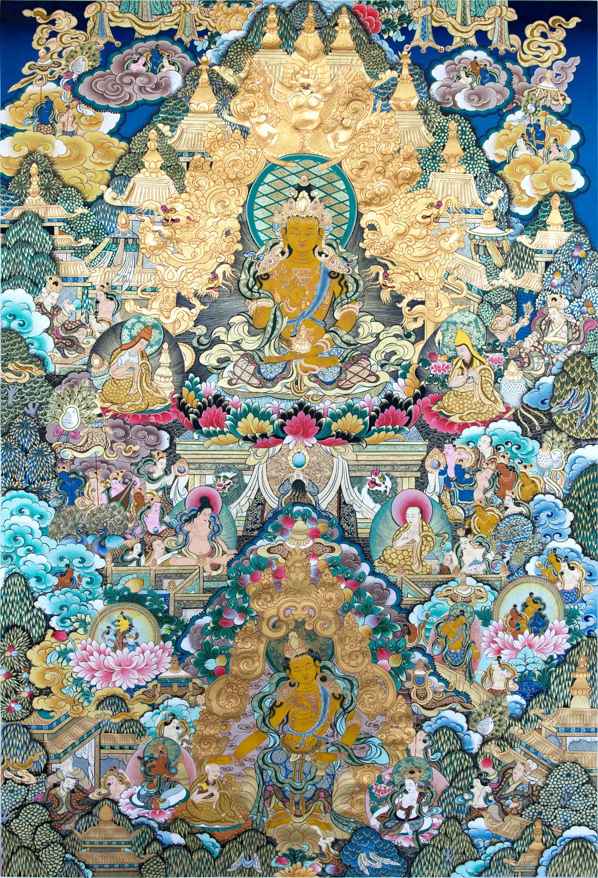 主尊未來(lái)世界彌勒佛菩薩,左邊描繪了噶當(dāng)派創(chuàng)世者阿底峽尊者與他的弟子。右邊描繪了格魯派的創(chuàng)世者宗喀巴大師與兩大弟子克主杰和迦側(cè)杰,中部周?chē)┓钫甙舜箅S喜菩薩文殊菩薩、普賢菩薩、觀世音菩薩、金剛手菩薩、虛空藏菩薩、地藏菩薩、彌勒菩薩、除蓋障菩薩,畫(huà)面四角供奉為彌勒佛未來(lái)世界的迎接與弘揚(yáng)佛法的情景。畫(huà)面上空描繪了仙女四處飛揚(yáng),空中漂浮著吉祥的圖案與神秘的瑞相等等。整體畫(huà)完之后選擇一個(gè)殊勝吉祥的日子點(diǎn)所有諸佛的五官,發(fā)髻、手勢(shì)、法器、畫(huà)面后部畫(huà)家要親自寫(xiě)聲、語(yǔ)、法的字號(hào)。作品完工之后寺院里進(jìn)行眾多活佛和高僧大德的加持與開(kāi)光儀式。