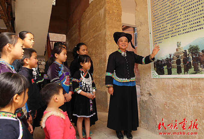 “女子太陽山祭祀”州級(jí)傳承人陸順梅(右一)帶著小朋友參觀“女子太陽節(jié)”展覽,并為小朋友講解壯族文化并為小朋友講解壯族文化