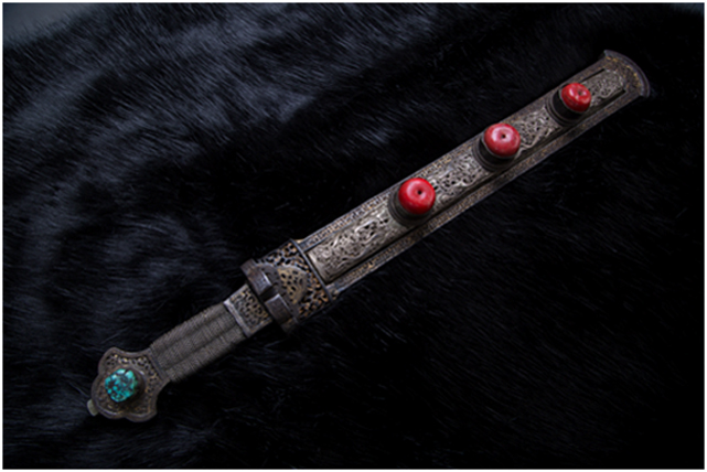 安多地區(qū)主要以放牧為主,牧民的刀主要用于宰殺和吃肉,有嚴(yán)格的男用女用之分,男式刀長度在一尺以上,女式刀在一乍左右,刀鞘的底部和刀柄的末端上翹,呈船形。安多人喜歡珠寶,頭飾、胸飾、腰飾無不光燦耀人,這些飾物同樣被用在刀上,刀鞘和刀柄錨金錯銀,鑲嵌著珊瑚和綠松石,像精美的藝術(shù)品。