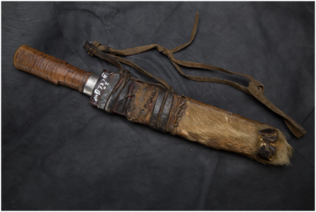 地處藏東的林芝地區(qū)一帶,也叫貢布地區(qū),居住著藏族、門巴族和珞巴族,這里山高林密,野獸出沒其間,靠山吃山,人們伐薪狩獵是家常便飯。所以人們使用的刀具以寬、長為多。刀鞘多為木質(zhì),外面用獸皮包裹,一般是用野獸腿骨上的皮,有些還帶有爪子。外在裝飾主要是附在獸皮上的毛色和趾爪。其用途除了捕獵格斗,更是人們在密林中劈荊斬棘的利器。