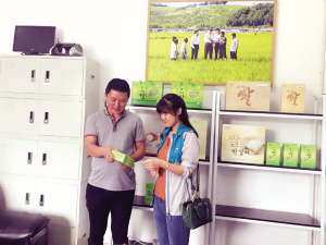 光東村創(chuàng)業(yè)者金君(左)介紹他公司生產(chǎn)的有機(jī)大米。