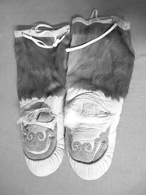 現(xiàn)收藏于民族文化宮博物館的這副狍皮手套,是鄂倫春族冬季狩獵時必備的傳統(tǒng)服飾之一。該手套拇指與四指分開,四指部分連成一體。手套通長48厘米、寬13厘米,套口處穿有一根可收縮的白色帶子。手腕處到套口是外翻毛皮,長21厘米。手心外翻皮毛長近5厘米,拇指和掌邊及四指前部用染色小塊獸皮剪裁成云卷蝴蝶紋進(jìn)行補(bǔ)繡,紅、綠線縫皮邊,云紋中間有一棱形藍(lán)色布裝飾。該手套選料精良、樣式古樸,是狍皮手套的精品,體現(xiàn)了鄂倫春族獨一無二的游獵文化。