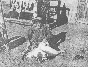 這之后,我們來到鄂倫春族的一個定居點(diǎn)——托河做調(diào)查。托河保留著比較完整的鄂倫春族狩獵文化,男人們打獵、捕魚,女人們則負(fù)責(zé)做飯、熟獸皮、用皮子做衣服等。女人縫獸皮衣時,用的針還是骨針,線則是野獸的筋。當(dāng)然,她們還用樺樹皮做各種生活用品,如籃子、盒子、筒子等。
