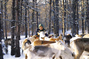 人類馴養(yǎng)馴鹿的歷史有1000多年。這是一種異常勇敢的生靈,生活在北極圈附近,分布在歐亞和北美大陸及一些大型島嶼。在極度惡劣的自然條件下,馴鹿為了繁育后代,每年都要冒著生命危險長途跋涉數(shù)百里,其堅韌不拔的意志力和不屈不撓的品格正是北極冰原精神的象征。在中國,馴鹿棲息在大興安嶺北段的寒溫帶針葉林中,處于半野生狀態(tài),這里有激流河、阿穆爾河、阿巴河、呼瑪河,有阿龍山、奧克里堆山等。食物主要是苔蘚,也吃石蕊、蘑菇及大木植物的嫩枝葉。鄂溫克族的祖先把鹿視為圣潔,賦予其許多美麗的神話和傳說。是啊,只要有了馴鹿,鄂溫克人便是幸福的。據(jù)考證, 我國的馴鹿與貝加爾湖東北部尼布楚河上游溫多苔原高地的馴鹿有淵源關系??梢哉f,鄂溫克人的馴鹿、狩獵、樺皮文化、薩滿教把北極文化延伸到了興安嶺。
