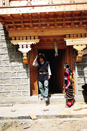 在珞巴族家中,男主外,女主內(nèi),分工相當(dāng)明確。當(dāng)達(dá)瓦在家里和我聊天時(shí),他的妻子群宗一直在忙碌著,忙著給我打酥油茶,忙著生火燒水、煮土豆,忙著照顧孩子。為了讓我能拍一張達(dá)瓦一家人穿珞巴族服裝的照片,大家費(fèi)了好大勁兒。他們從東家借來(lái)帽子,從西家找來(lái)褂子,也有從南家借來(lái)的飾品……終于,達(dá)瓦和群宗夫妻倆都穿戴上了本民族的服飾,我如愿以償?shù)亟o他們拍了一張全家福。