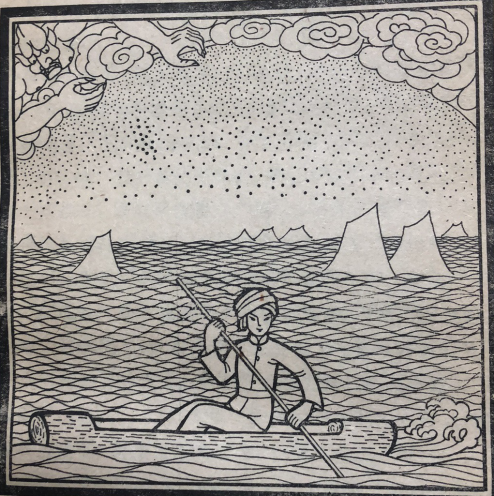 厄霞看見札努札別依然沒有餓死,又想出了一條毒計(jì):他把天河上的水放下來,整個(gè)大地變成白茫茫一片汪洋大海。跑到高山去的人僥幸沒有淹死。住在平地上的人,都被洪水淹死了,厄霞以為這一次札努札別也一定淹死了。但當(dāng)厄霞來看時(shí),札努札別坐在掏空了的木槽里漂在水面上,依然沒有淹死。于是,原來不知道造船的人們,從這次起,后世便知道造船了。