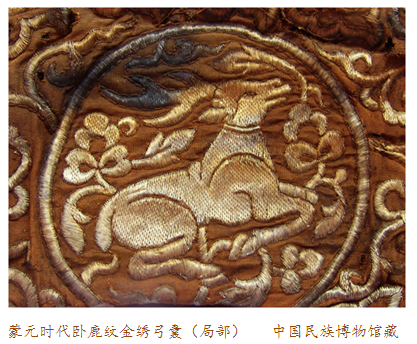 如果說在回回織工梭下的納石夫圖案總是帶有濃郁的伊斯蘭風(fēng)情,而我們在這只金繡撒袋上見到的臥鹿紋,則已是純粹中國特色的春水題材了。它是出自一位已經(jīng)深受中華文化濡染的回回繡女之手?還是一位已是織金高手的中原繡娘穿針引線完成了它?不論怎樣,在文化大交流、民族大融合的時(shí)代里,這只金繡撒袋顯露出中西文化合璧一體的氣息。