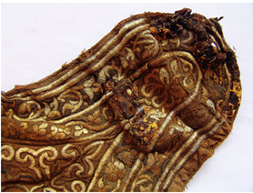 我們曾經(jīng)描述過元代納石失生產(chǎn)的空前絕后。蒙古民族把對于黃金的寶愛,傾泄進(jìn)元朝一百年的歷史時(shí)空。在整個(gè)13世紀(jì)的每一個(gè)歷史篇章,都鐫刻著納石失的金縷光影。我們在史料里看到,天子之衣是納石失,天子之裳是納石失,天子之履依然是納石失。那么,蒙元一代,還有什么是用黃金絲線耗盡心血織繡而成的呢?現(xiàn)在,我們看到了這只金繡弓囊。