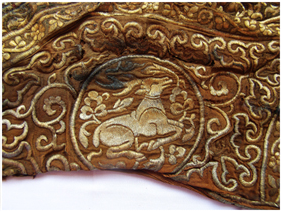 現(xiàn)在,我們就看見一只鹿,靜臥于金繡弓囊的中央。飛揚(yáng)流動(dòng)的黃金絲線勾勒出它宛如花朵一般的角,流露出遠(yuǎn)古神話對于鹿角神力的幻想和贊美。它以溫柔、嫻靜、優(yōu)美的姿態(tài),安祥地伏于卷草花卉紋中。曾經(jīng)與之相伴的弓影早已遠(yuǎn)去,嗖嗖作響的箭聲也已留在歷史那端。現(xiàn)在,它遺世獨(dú)立。