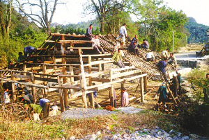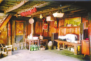 筆者看到的干欄式木樓和吊腳樓在使用的功能上相差無幾,上層住人待客,樓下四壁用木板圍擋,圈養(yǎng)畜禽,存放燒柴、農(nóng)具和秋收臨時堆放的糧食。豬圈靠里側(cè)依柱圍欄,其它空閑的地方打掃得干干凈凈,有的將織布機(jī)放在樓下明亮的地方。住房一般5間,兩頭兩間是偏廈,中間3間是寬敞的堂屋,一頭設(shè)火塘、土灶,為烤火、煮飯之處;另一頭的中柱供臨時設(shè)席敬神之用,也有的在板墻上設(shè)佛龕神位,供奉祖先;臥室依房柱用木板靈活隔間。大門有的開在房山墻一側(cè),也有開在中間的,皆登石階、板梯而上。吊腳樓一棟挨著一棟,小巷道曲折狹窄,只容牽牛和順向挑擔(dān)通過。