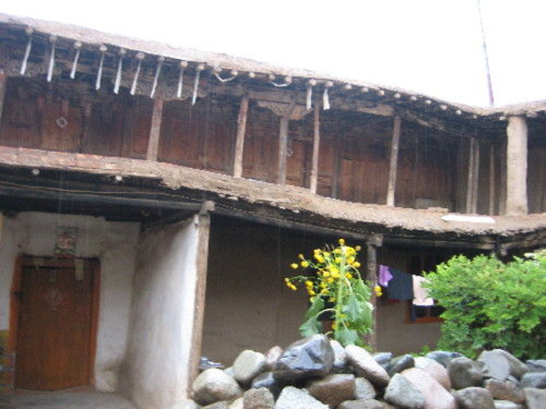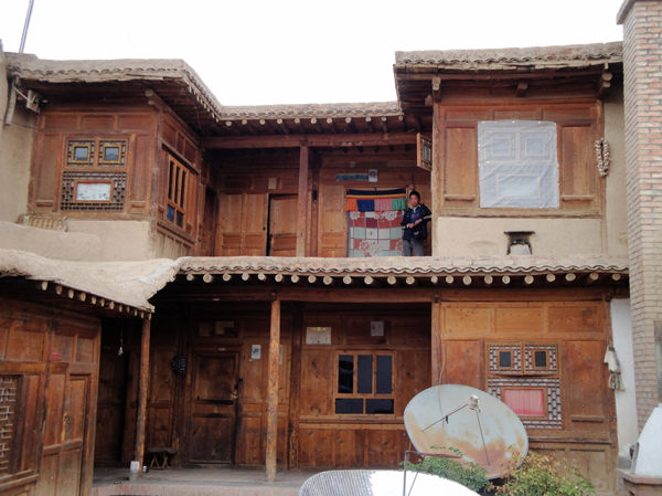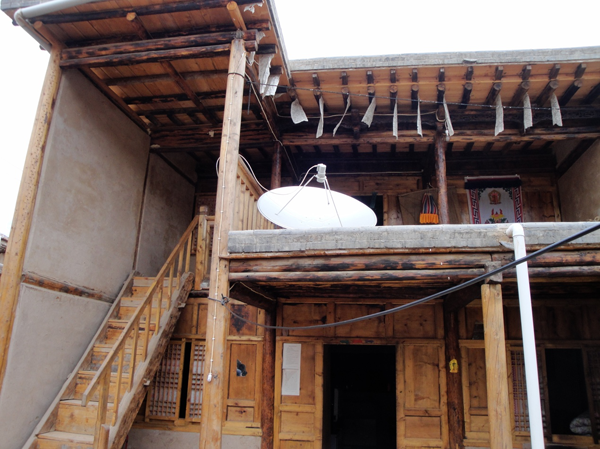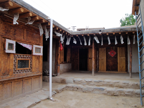 為改善狹小的寨內(nèi)空間,當(dāng)?shù)鼐用窬藿硕幽窘Y(jié)構(gòu)樓房,和青海鄉(xiāng)村民居庭院寬敞的特點(diǎn)形成了反差。寨內(nèi)民居庭院多為四合院式,房屋為土木結(jié)構(gòu)平頂房,一般民居都有飛椽花藻之類。屋內(nèi)一般以木板作隔扇,室內(nèi)有護(hù)炕木板、護(hù)墻木板墻圍,且多雕花草于其上。房屋一般面闊三間,正面以木板隔墻并裝上木板條方格小花窗。佛堂設(shè)在二樓,佛堂所在的房屋一般都是上房,和佛堂不同向的兩邊廂房一般做臥室。院落中央一般都有豎掛經(jīng)幡的旗桿,還設(shè)有桑臺(tái),具有明顯的藏式特點(diǎn)。