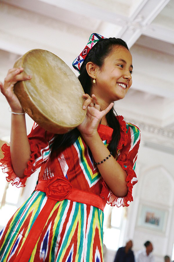 11歲的麥迪娜是小學(xué)五年級的副班長,在麥蓋提一小雙語班讀書,漢語好到可以給我做翻譯,向老藝人提問。麥迪娜的世界已經(jīng)和老藝人、和叢林中艱難漁獵的祖先不一樣了。她在麥西來甫中敲達甫手鼓,在活動中心學(xué)習(xí)電子琴,是女子“手鼓樂隊組合”中8位11—3歲女孩子中的一個。她希望將來能在北京上學(xué)、成為醫(yī)生治好奶奶的糖尿病。她會用漢語唱國歌和《歌聲與微笑》,還有《茉莉花》,雖然吐字與調(diào)子不太那么準(zhǔn)。她圍著阿布都克萊姆(被稱作“維吾爾人的趙本山”的維吾爾族諧星)索要簽名的同時,還喜歡羅志祥,以韓國偶像組合EXO為榜樣。麥迪娜還上過電視,常有喀什地區(qū)的、自治區(qū)的、全國的媒體到麥蓋提來采訪、錄制刀郎麥西來甫。