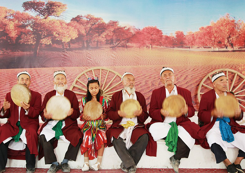 從麥迪娜9歲起教她達甫手鼓的是母親,把她打扮得漂漂亮亮的、去趕一場又一場麥西來甫的也是母親。作為央塔克鄉(xiāng)文化站站長,麥迪娜的母親整年都忙碌得要死。麥蓋提縣央塔克鄉(xiāng)以刀郎舞、農(nóng)民畫立鄉(xiāng),觀光者多,活動多,任務(wù)多,接待多。它不僅是旅游之地,也是生活之地。麥迪娜的母親是位典型的維吾爾族女性,眉眼如刻,目光流轉(zhuǎn),婚后迅速發(fā)胖。在一大群女人當(dāng)中,她一定是最搶眼、最熱烈、最能干的那個。無論哪家舉行麥西來甫,都會邀請她。她總是提前到來,手腳麻利地幫忙,氣度昂揚地端桌布菜,熱情洋溢地放歌起舞。有時,母親也會提前帶麥迪娜到舉辦麥西來甫的家庭中,麥迪娜就會學(xué)母親的樣子,進廚房幫忙干活,直到麥西來甫開始,才換上衣裙,擠身樂師中間。麥迪娜沒有時間像其他孩子那樣,在鄉(xiāng)野、麥西來甫上盡情嬉戲,正如她的母親,只能將女兒的日常生活托付給奶奶照顧。