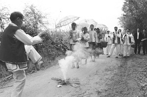第二天一早,八音隊在前面邊走邊吹長調(diào)曲,由8人組成的迎親隊伍一路歡歌笑語地來到新娘家村口。八音隊要猛吹迎親曲,新娘家的人才出來迎接。這時,村里的一位長者拿著一把稻草、少許米飯、一個雞蛋,從村子走出來并緩緩點(diǎn)燃稻草,一邊念咒語,一邊向火堆拋雞蛋。然后,迎親隊伍走過火堆才能進(jìn)村。