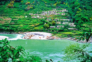在怒江上游峽谷聚居的傈僳村寨都建在高山的半山上,其民居俗稱為“千腳落地房”。說“千腳落地”雖有些夸張,但也足以形象地說明峽谷溫?zé)岬臍夂蚝蜕礁咂露傅牡乩項l件。在雨季時,“千腳”阻力最小,使山洪順利傾瀉而下,又很快干爽,免受潮氣。而且不需挖地動土,不必移石砌墻,對木料沒有過高要求,長短皆用,在生態(tài)脆弱的高山峽谷也算環(huán)保建筑。“千腳落地”是因建房時先在確定的屋基上依斜坡程度和住房面積打進(jìn)數(shù)十根到百余根木樁為基樁,以保證居室樓板的平正?;鶚洞蚝煤螅拿媪魩赘咧鳛檎麄€房屋的立柱外,在密集木樁所形成的平面上滿鋪竹篾編織的樓板,還有竹篾圍墻,所有結(jié)構(gòu)皆用竹篾綁扎。屋頂鋪苫草或蓋木片瓦,近幾年,已陸續(xù)換上了大塊的水泥波形瓦。房門開在山墻一側(cè),有廊道,可做曬臺,平時穿的衣服都搭在這兒,也是婦女做針線活的地方。隨著怒江峽谷的開發(fā)和新農(nóng)村建設(shè)的深入,通路的村寨將很快會改變面貌。