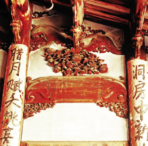 畬族的古老民居都是深宅大院,堂屋高大、寬敞,也是裝飾的重點(diǎn),神龕、窗欞都有鏤空木雕和浮雕裝飾。堂屋依木柱用木板隔間,板壁上露出半圓的木柱,在對應(yīng)的木柱上貼著紅紙濃墨的對聯(lián)——每逢新婚、祝壽、春節(jié)等重大節(jié)慶都要貼對聯(lián)。
