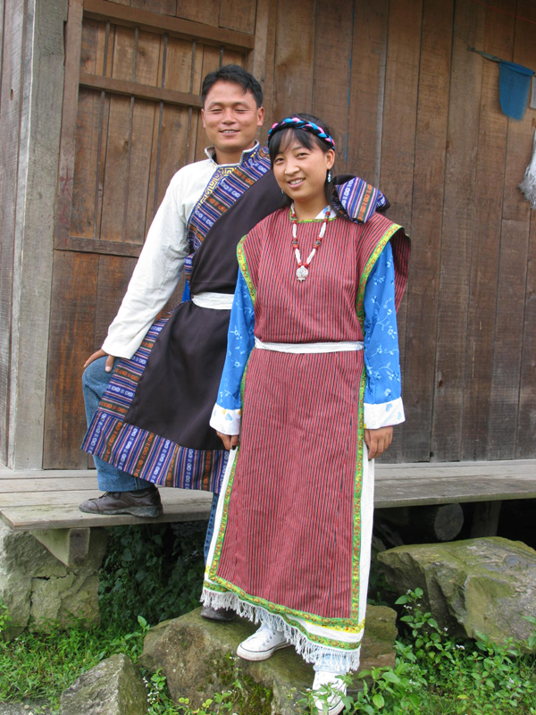門隅地區(qū)的男女都喜愛用羊毛織品氆氌為原料,穿氆氌袍和絳紅色的長袍,腰間系一條赭色腰帶;女子內(nèi)衣以棉織和蠶織品做原料,顏色絢麗多樣,無開襟、無領(lǐng)、無扣子,只開一個圓口或三角口由頭套穿。外加長袍及上身穿黑氆氌做的“熱故”(門巴語,留有邊子的短服),下身腰部圍一塊白氆氌做的“吉瑪”(門巴語,圍裙)圍裙,并在圍裙右下角綴有“雍仲”(藏語,意為堅(jiān)固、永固。原始宗教苯教奉為神秘字,并以左旋逆時針方向之形字紋作為代表)吉祥圖案,有的繡有“日月吉祥”圖案。