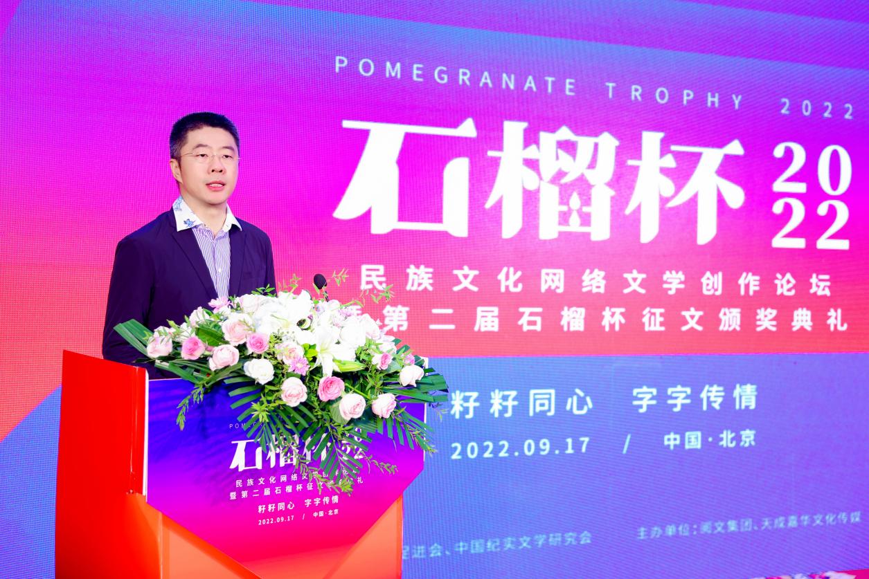 2022年9月17日,民族文化網(wǎng)絡(luò)文學(xué)創(chuàng)作論壇暨第二屆石榴杯征文頒獎活動在民族文化宮舉行。本次活動得到了國家民委所屬中國少數(shù)民族文化藝術(shù)促進會和中國紀(jì)實文學(xué)研究會的指導(dǎo)與支持,由閱文集團、北京天成嘉華文化傳媒主辦,天成達(dá)星國際傳媒承辦。
