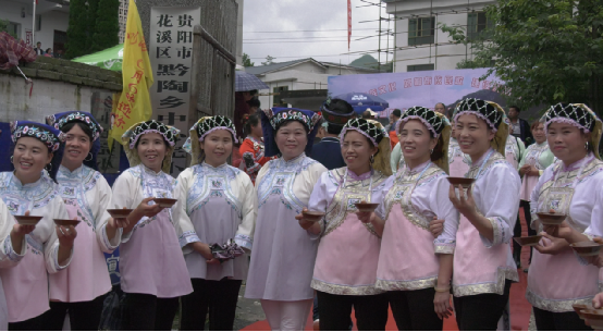 布依族青年們抬著族中神物銅鼓,吹著長長的號(hào)角,臉上滿是對(duì)民族節(jié)日的期待之情,驕傲又興奮;成群結(jié)隊(duì)的孩童穿著本民族傳統(tǒng)服飾,手拿錦帶,熱忱歡迎遠(yuǎn)道而來的客人;能歌善舞的布依阿姐笑臉相迎,唱著布依族的歌謠,一字排開堵在門前,客人們想要進(jìn)去參加這次盛會(huì),就得過三關(guān),干了三碗攔路酒。