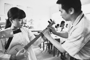 圖為一位音樂教師在指導(dǎo)學(xué)生調(diào)試侗族琵琶。 王炳真攝影報(bào)道