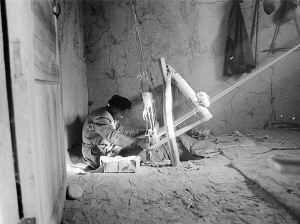 紡線車高約80厘米,寬約60厘米,長(zhǎng)約22厘米。紡線車也和切克曼一樣古老,完全靠手工搖,沒有絲毫機(jī)械動(dòng)力。老人紡線時(shí),右手搖動(dòng)紡線機(jī),左手慢慢放絨,把比普通棉紗線粗兩三倍的絨線纏繞在錠上。這個(gè)工序叫做加捻和卷繞。隨著紗條抽長(zhǎng)拉細(xì),纖維變得更加平直,紗條強(qiáng)力下降,容易斷裂或延伸,因此需要加上適當(dāng)捻度使其具有一定的強(qiáng)力。這個(gè)過程結(jié)束后,老人起身說:“經(jīng)過加捻和卷繞之后,要用水沖洗,晾干后就可使用了?!?/p>
